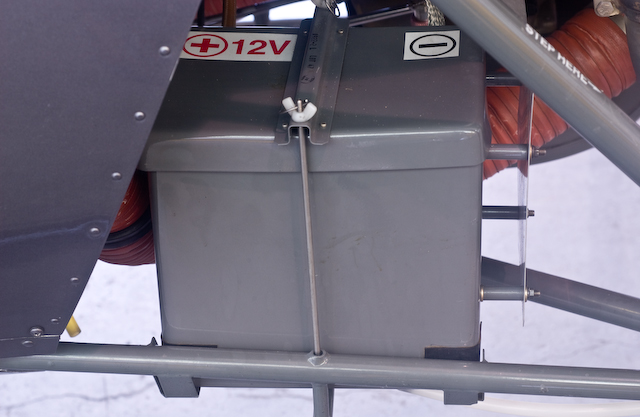Make sure the battery and the relay are both securely mounted to the aircraft. In some R22s, the battery is inside the instrument panel. In others it is under the left hand passenger seat. From the Alpha and Beta model on, this location in the engine compartment is typical.